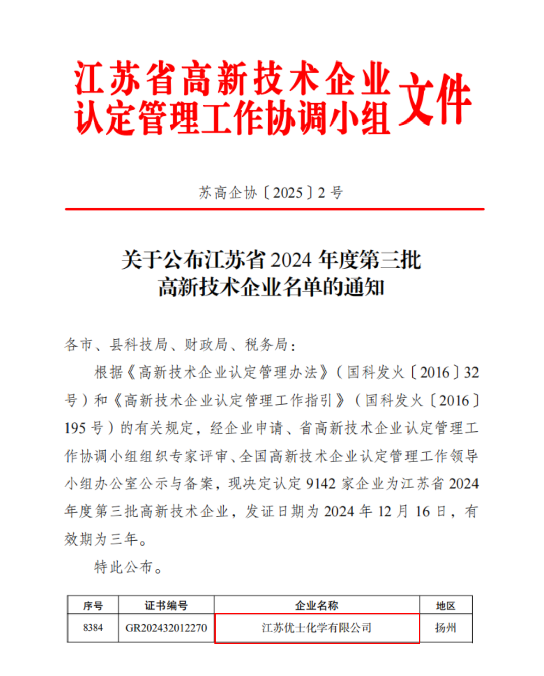 ? ? ? ?克日,,,,,江苏省科技厅宣布《江苏省2024年度第三批高新手艺企业名单》,,,,,我司子公司优士化学顺遂通过高新手艺企业复评。。。。。